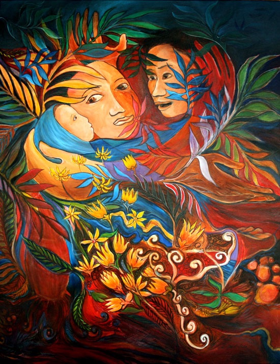 I painted ” La Sagrada Familia” the day after the 2016 Election. It was mainly inspired by a trip with my partner Evie and encountering some undocumented immigrants. We were sitting around a bonfire one night with this young man from Guatemala who told us why he was in the United States, his struggles, his hopes, and fears. He had come here as a teenager, only to be deported and then almost beaten to death in Mexico. He eventually crossed the desert again to the United States. Everything about him broke us. He has the image of God within him. As we were hearing all of the hateful rhetoric that was anti-immigrant, anti-stranger, his experience immediately came to mind while creating this modern holy family image and how the refugee Jesus, Mary, and Joseph must have felt fleeing from Herod 2,000 years ago.