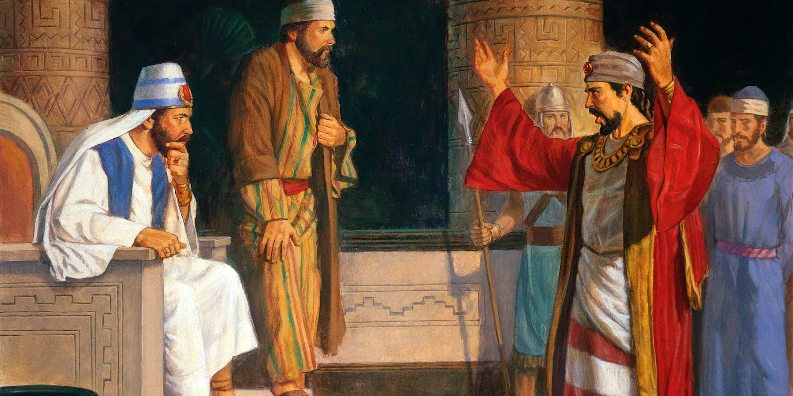 - The overzealousness of the people and the officials. Although he was brought before the chief judge, it seems to be the ecclesiastical authorities that seem to be questioning him. This would suggest that on being brought before the chief judge, they realised that there was no crime, but they took the opportunity to question him as he was stirring people up. There is obviously a huge interplay between ‘church’ and ‘state’ and so it is hard to differentiate, and Mormon’s editorialising suggests that he feels that their actions in taking him into custody was correct as he describes that people of Ammon “were more wise than many of the Nephites; for they took him, and bound him, and carried him before Ammon, who was a high priest over that people” (Alma 30:20).